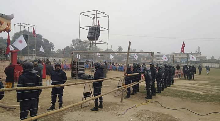 राजविराजस्थित राजरंगशालामा आयोजना गरिएको कार्यक्रमस्थलमा नेपाल प्रहरी र सशस्त्र प्रहरीको टोली ठूलो संख्यामा परिचालन गरिएको छ । कार्यक्रममा कुनै अप्रिय घटना नहोस् यसका लागि सप्तरी प्रशासनले कार्यक्रम स्थल, आसपास क्षेत्र तथा राजविराज नगरपालिकाको विभिन्न चौक तथा मुख्य बाटोमा पनि प्रहरी परिचालन गरेको छ । राजविराज रंगशालामा हुने सभामा उपप्रधानमन्त्री ईश्वर पोखरेल, सहरी विकासमन्त्री प्रभु साह, महिला बालबालिका तथा ज्येष्ठ नागरिक मन्त्री जुलीकुमारी महतोलगायतले सम्बोधन गर्ने बताइएको छ ।