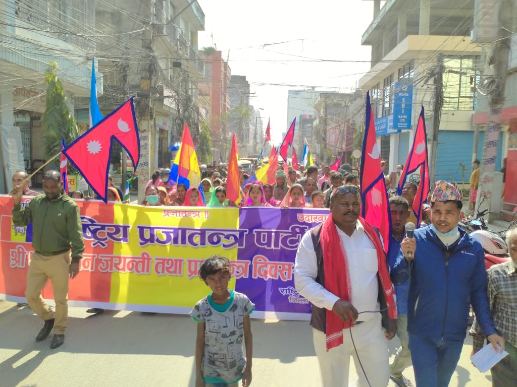 वीरगन्ज : पर्सा फाल्गुन ७ गते राष्ट्रिय प्रजातन्त्र पार्टी जिल्ला कार्यसमिति पर्साले जिल्ला अध्यक्ष अंगद ठाकुरको अध्यक्षता मा ७१ औं प्रजातन्त्र दिवसको तथा श्री ५ त्रिभुवनको समझना स्वरुप कार्यक्रम भव्यताका साथ सफल भएकोछ।बिरगंज महानगर परिक्रमा गरी घण्टाघरमा कोणसभामा परिणत भएको थियो।