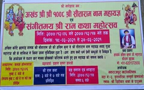 सिरहा । श्री गणेशाय नम: संगीतमय श्रीराम कथा महोत्सव एंवम अखण्ड श्री श्री १००८ श्री सीताराम नाम महायज्ञ हुने भएको छ। यहि आउँदो चैत्र ६ गते देखी चैत्र १४ गते दिनांक ( 19-03-2021 देखि 27-03-2021 ) सम्म उक्त यज्ञ हुने यज्ञ आयोजक कमिटीले जानकारी गराएका छन। अखिल कोटी ब्रह्माण्ड नामक श्रीसीताराम जीको असिम कृपाले श्री सीताराम नाम महायज्ञ नवाह पुज्य महाराज श्रीको साधनामा गर्ने सुनिश्चित भएको छ।