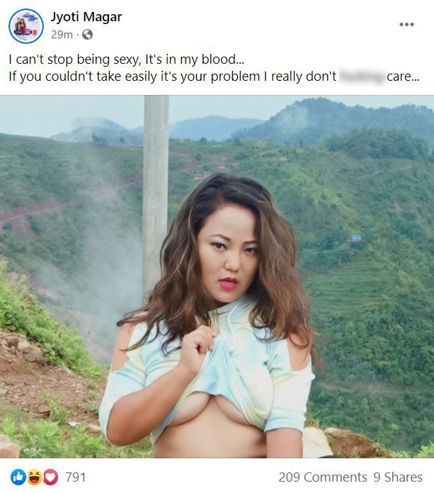 एक कार्यक्रमका लागि नेपालगञ्ज उड्नुअघि उनले लेखेकी छन्–‘म से’क्सी हुन रोक्न सक्दिनँ । यो मेरो रगतमा छ । यदि यसलाई तपाईंले सहजै लिन सक्नुहुन्न भने यो तपाईंको समस्या हो । मलाई बाल मतलब !’