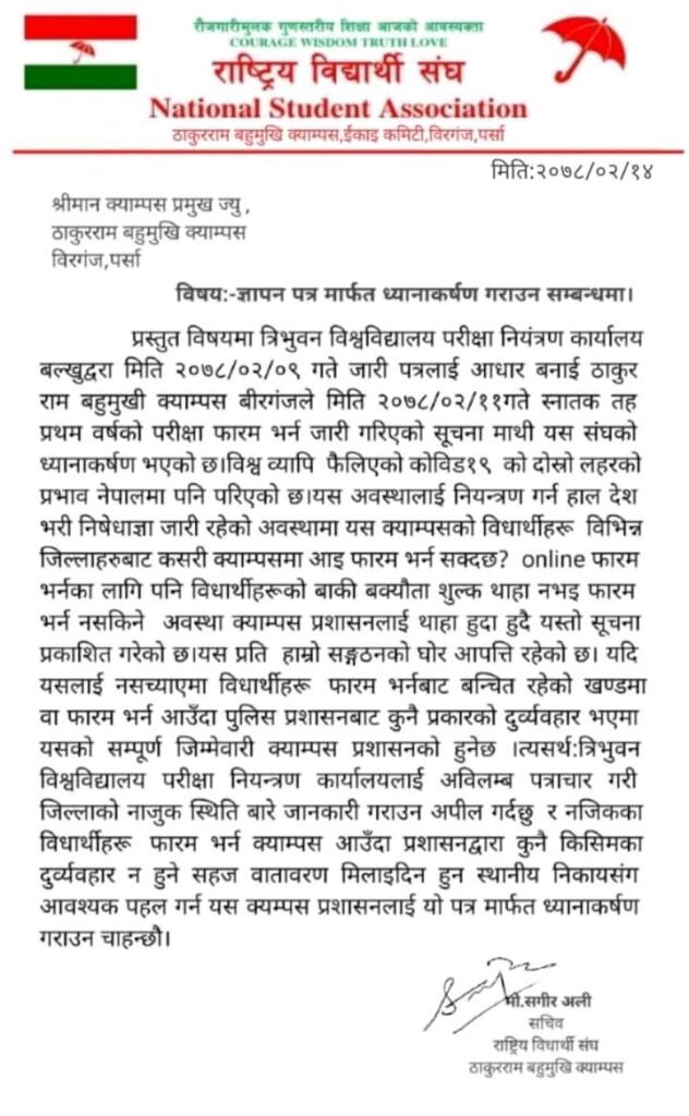 मधेश टप बिरगंज , विश्वाब्यापी फैलिएका कोरोना भाइरस (COVID19) कालमा चारै तिर नेपाल सरकारको स्थानिय निकायद्वारा लगाइएको निषधाज्ञा/ लकडाउनको बेला त्रिभुवन विश्वविद्यालयले जारी गरेको सूचना मार्फत प्रथम वर्षको परीक्षा फारम भर्ने निर्णय प्रति आपत्ति व्यक्त गर्दै राष्ट्रिय विद्यार्थी संघका ठा.रा. ब इकाई सचिव मो. सागिर अली द्वारा Online(Messenger) मार्फत क्याम्पस प्रमुख ज्युलाई ध्यानाकर्षण गराई ज्ञापन पत्र बुझाइयो।