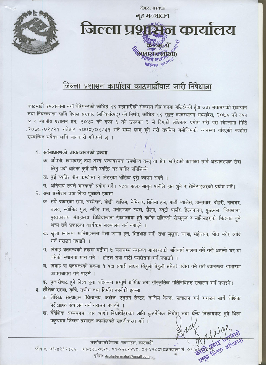 काठमाडौं । काठमाडौं उपत्यकामा जेठ २१ गतेदेखि पुन: ११ दिन निषेधाज्ञा थप भएको छ । बुधबार काठमाडौं, भक्तपुर र ललितपुरका प्रमुख जिल्ला अधिकारीको बैठकले जेठ ३१ गतेसम्म निषेधाज्ञा थप गर्ने निर्णय गरेको हो ।