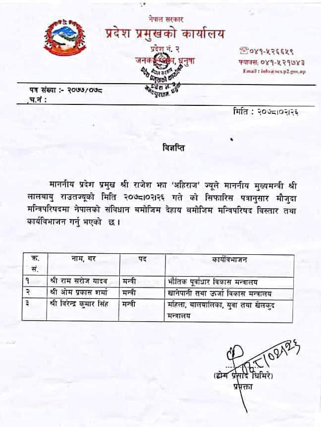 जनकपुरधाम, जेठ २६ । मुख्यमन्त्री लालबाबु राउतले मन्त्री परिषदको विस्तार गर्नु भएको छ ।