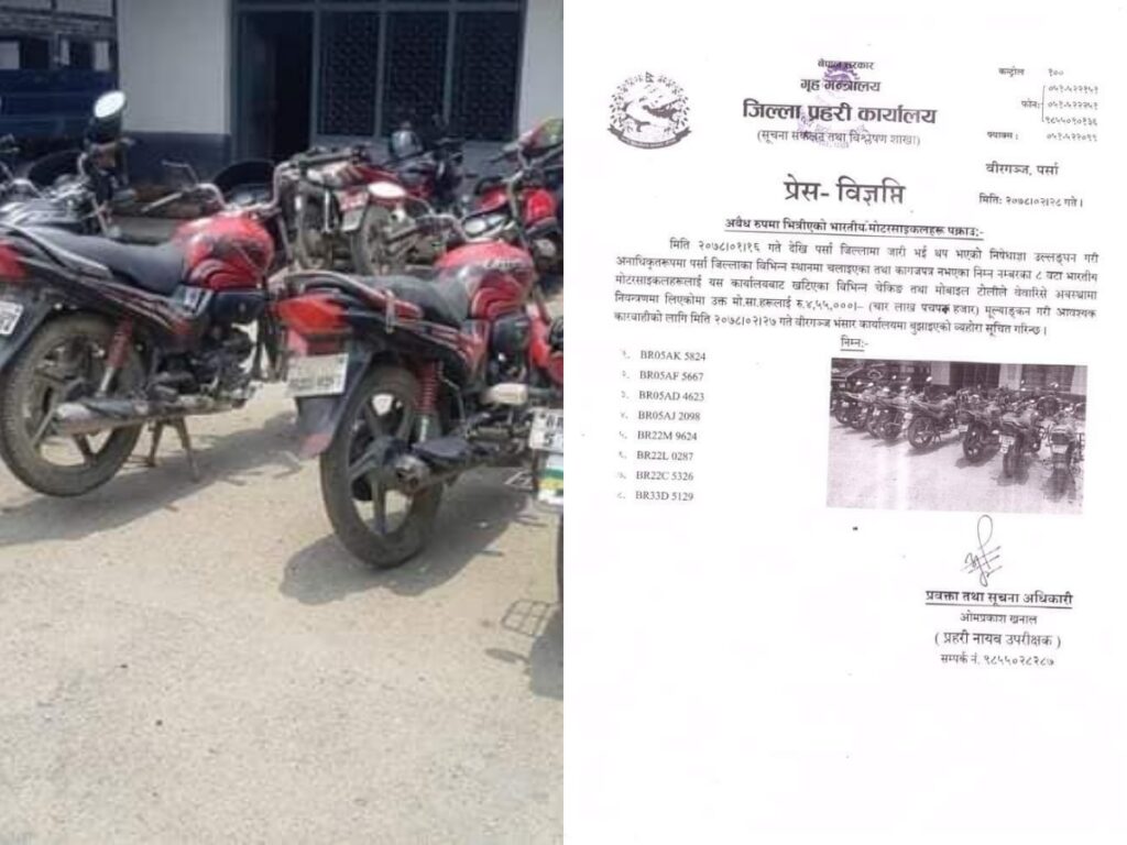 पवन प्रसाद साह/बिरगंज :  मिति २०७८।०१।१६ गते देखि पर्सा जिल्लामा जारी भई थप भएको निषेधाज्ञा उल्लङ्घन गरी अनाधिकृतरूपमा पर्सा जिल्लाका विभिन्न स्थानमा चलाइएका तथा कागजपत्र नभएका निम्न नम्बरका ८ वटा भारतीय मोटरसाइकलहरूलाई यस कार्यालयबाट खटिएका विभिन्न चेकिङ तथा मोबाइल टोलीले वेवारिसे अवस्थामा नियन्त्रणमा लिएकोमा उक्त मो.सा.हरूलाई रु.४,५५,०००।– (चार लाख पचपन हजार) मूल्याङ्कन गरी आवश्यक कारवाहीको लागि मिति २०७८।०२।२७ गते वीरगञ्ज भंसार कार्यालयमा बुझाइएको जिल्ला प्रहरी कार्यालय पर्सा का प्रवक्ता तथा सूचना अधिकारी एंव प्रहरी नायब उपरीक्षक ओमप्रकाश खनाल ले जानकारी दिनुभयो।