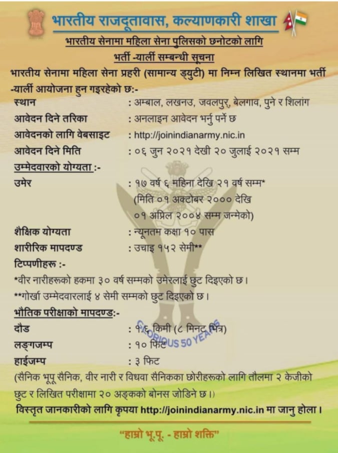 पालस्थित भारतीय राजदूतावासको कल्याणकारी शाखाले सूचना जारी गर्दै नेपाली महिलाहरू पनि भारतीय सेनामा महिला सेना प्रहरी (सामान्य प्रहरी) भर्ना हुन पाउने जानकारी दिएको हो।