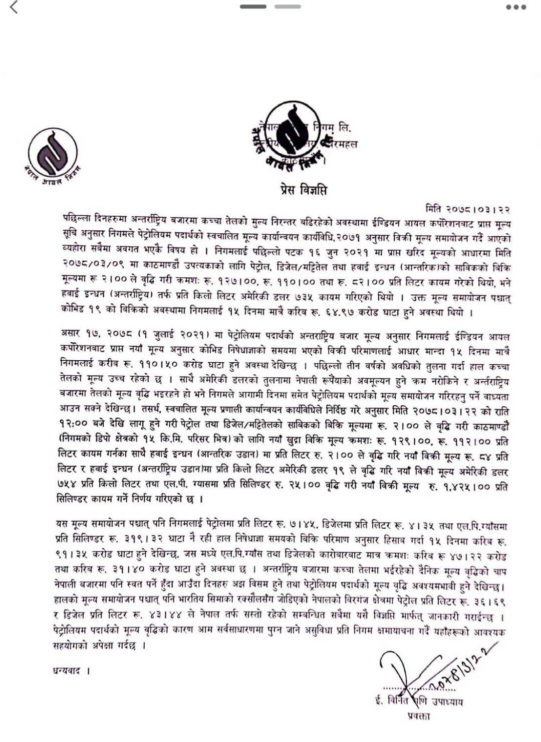 डिजेल, पेट्रोल र मट्टीतेलको मूल्य २ रुपैयाँ बढाइएको निगमले जनाएको छ ।  मूल्य बढेसँगै डिजेल र मट्टीतेल प्रतिलिटर ११२ रुपैयाँ, पेट्रोल १२९ रुपैयाँ पर्ने छ  । त्यस्तै निगमले  आन्तरिक तर्फको हवाई ईन्धनको मूल्य प्रतिलिटर २ रुपैयाँले बढाएर प्रति लिटर ८४  रुपैयाँ पुर्याएको छ । अन्तर्राष्ट्रिय तर्फको उडानको हवाई ईन्धनको मूल्य प्रतिकिलोलिटर १९ अमिरिकी डलर बढेर प्रति किलोलिटर ७५४ डलर कायम भएको छ । खाना पकाउने ग्यासको मूल्य प्रति सिलिण्डर २५ रुपैयाँले बढेर प्रति सिलिण्डर १४२५ रुपैयाँ कायम भएको छ ।