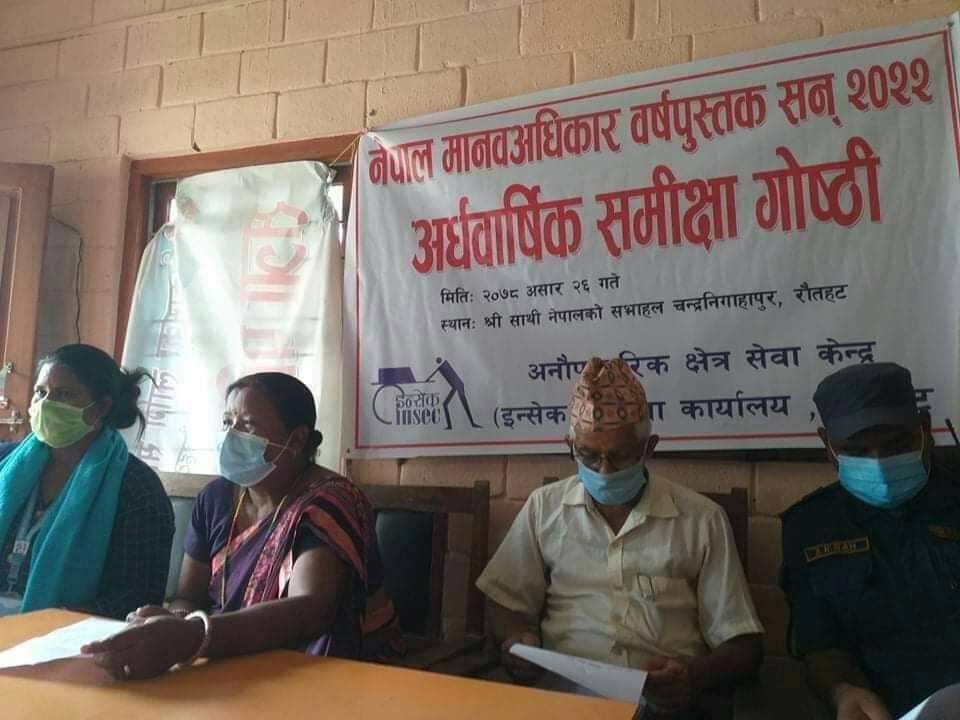 गत २०७७ पुस १६ गते यता २०७८ जेठ मसान्तमा बहुविवाह , बालविवाह , बलात्कार , बलात्कारका प्रयास , कुटपिट तथा एसिड प्रहार जस्ता ४१ ओटा घटना भएको रौतहटका इन्सेक प्रतिनिधि कोपिला तिमल्सिनाले बताउनु भयो ।