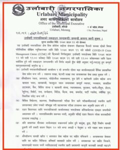उर्लाबारी नगरपालिकाको विपद् व्यवस्थापन केन्द्रको सोमबार बसेको बैठकले कोरोनाको ‘चेन ब्रेक’ गर्न बुधबार बिहानबाट लागु हुनेगरी औषधि, दुध डेरी, कलेजका परीक्षा र खानेपानी सेवाबाहेक अन्य सबै सेवा तथा व्यवसायहरू बन्द गर्ने निर्णय गरेको हो ।