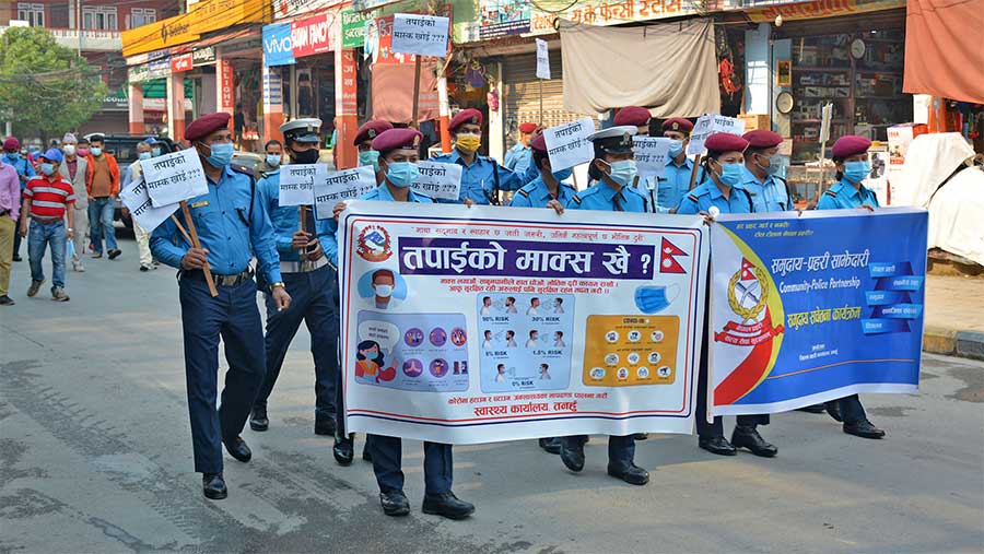 अहिले जिल्लाभरीनै प्रहरीले मास्क नलगाइ घर बाहिर निस्कने सर्वसाधरण, सवारी चालकलगायतलाई रोकेर ‘तपाईको मास्क खै?’ भनेर प्रश्न गर्न थालेका छन् । प्रहरीको टोलीले “तपाईको मास्क खोइ ?’, ‘मास्क र सेनिटाइजर प्रयोग गरौँ, कोभिड–१९ बाट बचौँ’ ‘मास्क लगाऔ, कोरोनाबाट बचौँ’ लगायतका प्लेकार्ड र हातमा मास्क बोकेर जिल्लाका चोकचोकमा पुगेर सर्वसाधरणलाई मास्क लगाउन अनुरोध र सचेत गराइरहेको छ ।