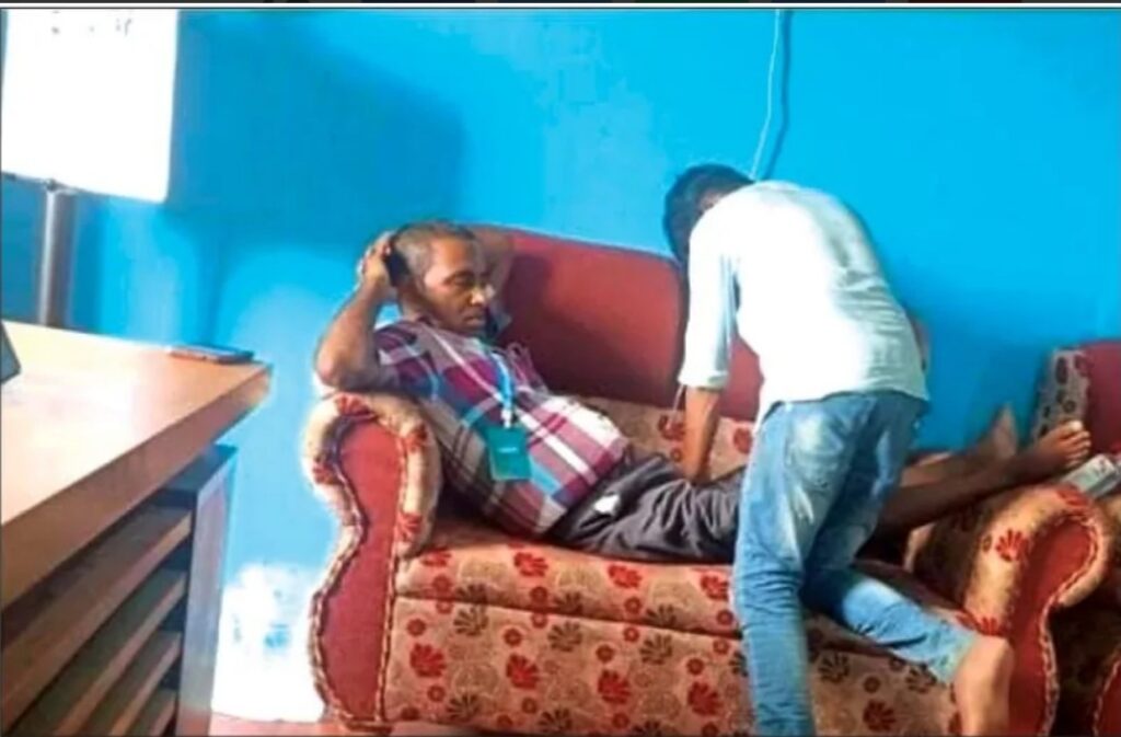 कार्यालयको सोफामा मेयर दास सुतेका छन् भने कार्यालय सहयोगी करन उनको खुट्टामा मसाज गरिरहेके छन् ।