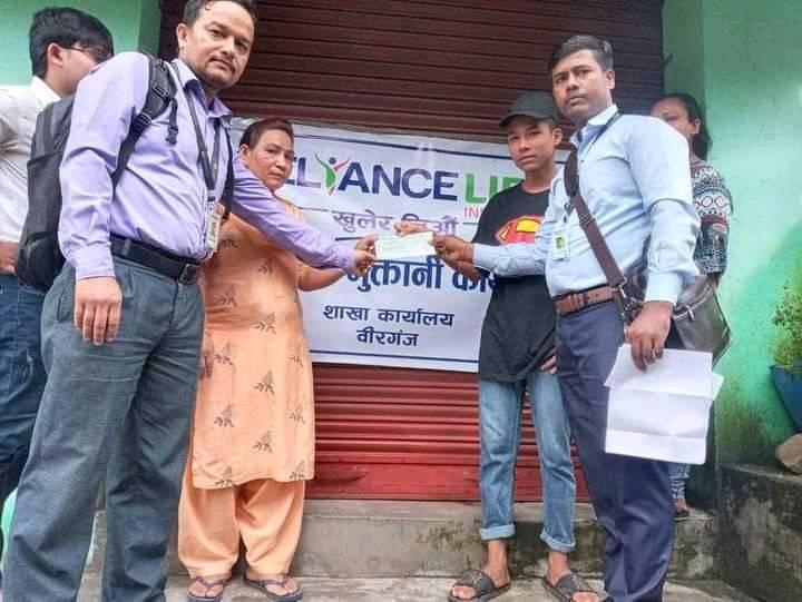 बीरगंज : रिलायन्स लाइफ इन्स्योरेन्स लिमिटेड शाखा वीरगंज ध्दारा शुक्रवारका दिन मृत्यु दावी भुक्तानी हस्तान्तरण गरेको छ। सो कार्यक्रममा शाखा प्रमुख देव प्रकाश पटेल,बजार प्रतिनिधि प्रभात बहादुर क्षेत्री,SAM रामप्रकाश सर्राफ तथा स्थानीय दिलीप कुमार साह,सीता थापा,आरती थापा लगायतको उपस्तिथी रहयो ।