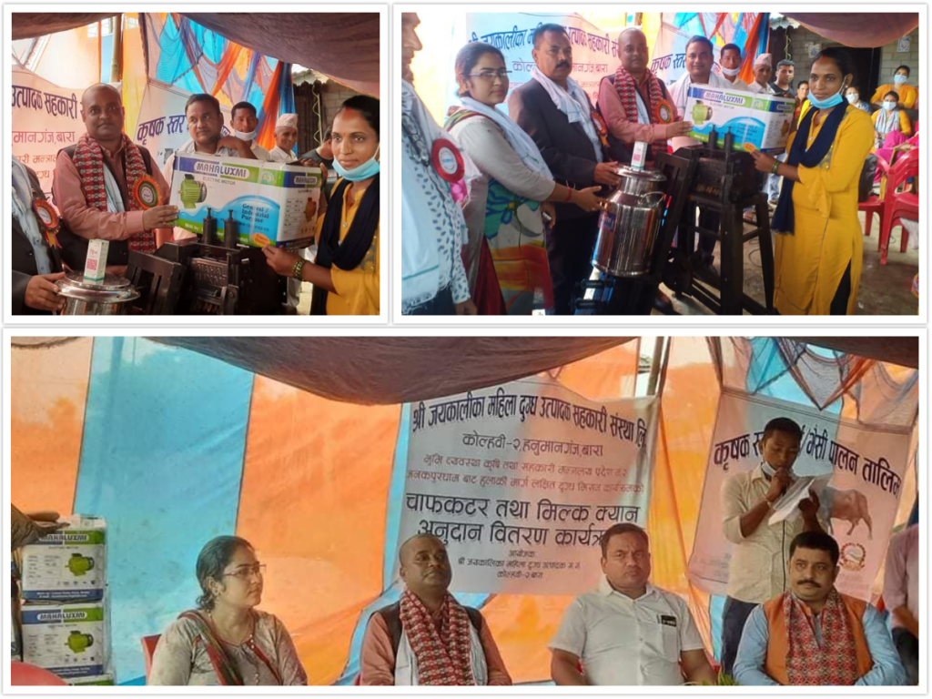 प्रदेश सरकारको हुलाकी मार्ग दुग्ध मिशन कार्यक्रम अन्तर्गत जयकालिका महिला दुग्ध उत्पादन सहकारी संस्था लि. कोल्हवी नगरपालिका बाराका किसानहरुलाई इलेक्ट्रीक च्यापकटर, मिल्क क्यान तथा औषधी लगायतका सामग्रीहरू एक कार्यक्रम बिच वितरण गरिएको छ ।