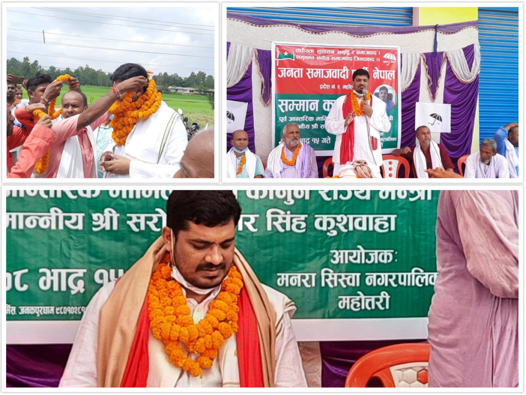 जनकपुरधाम, १५ भदौ । जनता समाजवाटी पार्टीका पूर्व राज्यमन्त्री सरोज सिंह कुशवाहाको गृह जिल्ला महोत्तरीको मनरा शिश्वा नगरपालिकामा नेता तथा कार्यकर्ताहरुले मंगलवार भव्य स्वागत गरेका छन् ।