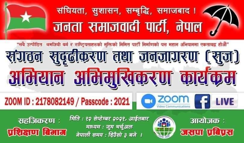 सबै उत्पीडित श्रमजीवी वर्ग र राष्ट्रियताहरुको मुक्तिको निमित्त पार्टी निर्माणको यस महान अभियानमा एकतावद्ध होऔ भन्ने मुल  नाराका साथ प्रवास विशेष समिति जनता समाजवादी (जसपा) द्वार,आयोजना गरिएको कार्यक्रम (जुम) भर्चुअल माध्यमबाट हुने र उक्त कार्यक्रम कतारको समय अनुसार मध्याह्न १२:२५ बजेबाट सुरु हुनेछ।आयोजकले शुभचिन्तक एव शुभेच्छुक संचारकर्मीहरुको लागि तल उल्लेखित जुम आईडी र पासकोड मार्फत जोडिन समेत आग्रह गरेका छन ।