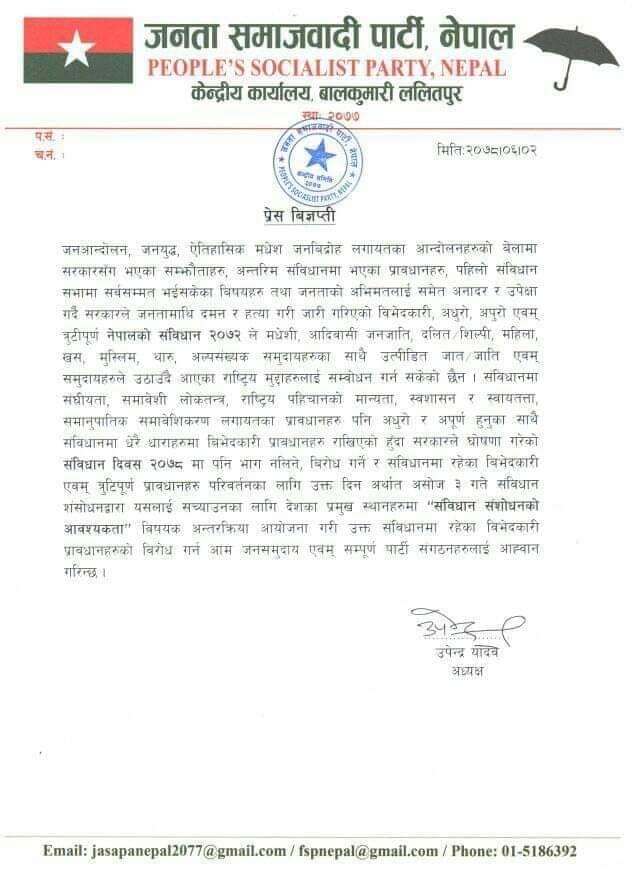 अध्यक्ष यादवले  शनिबार विज्ञप्ति जारी गर्दै संविधानको विरोध गर्न र संशोधनद्वारा सच्याउनका लागि देशका प्रमुख स्थानहरुमा अन्तरक्रिया कार्यक्रम गर्न आह्वान गरेका छन् ।
