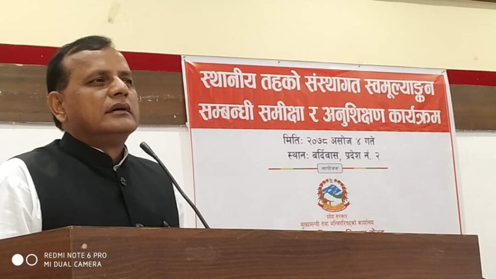 प्रदेश तथा स्थानीय शासन सहयोग कार्यक्रम अन्तर्गत प्रादेशिक सुशासन केन्द्रले बर्दिवासमा आयोजना गरेको स्थानीय तहको संस्थागत स्वमुल्यांकन सम्बन्धि समिक्षा एवं अनुशिक्षण कार्यक्रमलाई समुदघाटन गर्नु हुँदै मुख्यमन्त्री राउतले सो कुरा बताउनु भएको छ ।