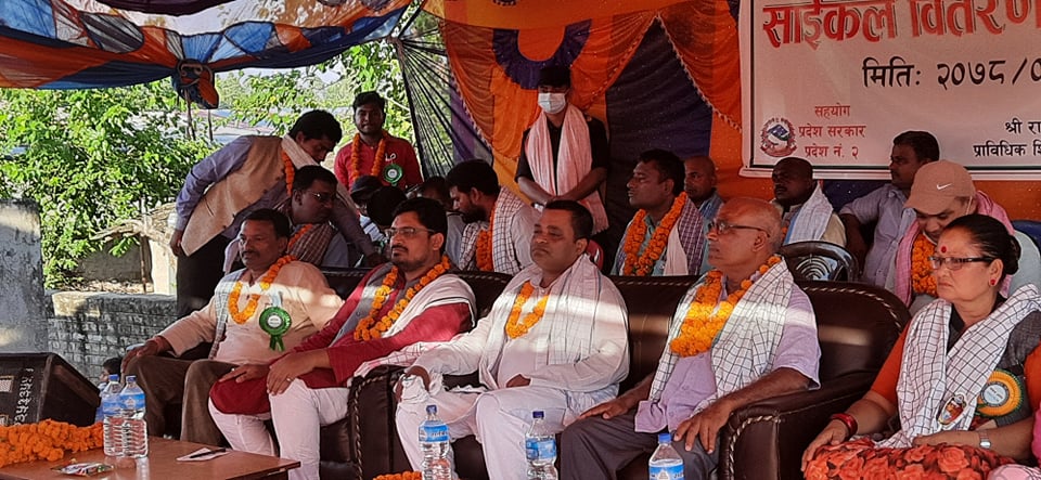 जनकपुरधाम । महोत्तरीको बर्दिवास नगरपालिका वडा न. ९ पशुपतिनगर मा आयोजित साइकल बितरण कार्यक्रममा प्रमुख अतिथि प्रदेश २ का अर्थ मन्त्री शैलेन्द्रप्रसाद साह छ्न् ।