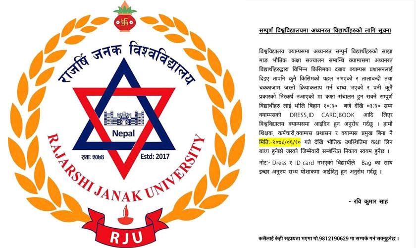 जनकपुरधाम,असोज १५ गते । कोरोना संक्रमणको कारणले  लामो समय देखि बन्द रहेको राजर्षि जनक विश्वविद्यालयले  आईतबार देखि खुल्ला हुने भएको हो  ।