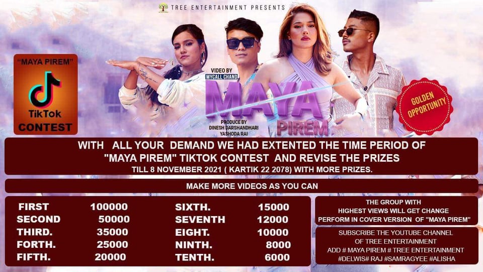 नव कलाकार देलविस दर्शनधारी र राज तुम्बाहाम्फेले डेब्यु गरेको माया पिरेम बोलको गीतको म्यूजिक भिडियोमा टिकटक प्रतियोगीताको समय अवधि बढाइएको छ । करिब एक हप्ता अगाडि युट्युबमा सार्बजनिक भएको अभिनेत्री सम्राज्ञी राज्यलक्ष्मी शाह अभिनित गीत ‘माया पिरेम’ यतिबेला लोकप्रिय भैरहेको छ ।