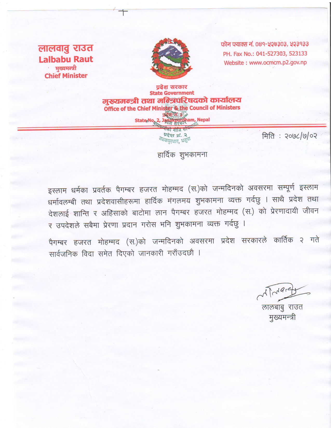 मुख्यमन्त्री लालबाबु राउतले पैगम्बर हजरतको जन्मदिनको अवसरमा शुभकामना मन्तव्य जारी गर्नु हुँदै प्रदेशमा विदा समेत रहेको जानकारी गराए।