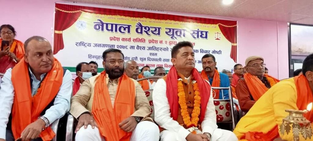 जनकपुरधाम, कार्तिक ६ : वैश्य समुदायबाट प्रतिनिधित्व गर्ने पुर्व मन्त्री तथा सांसदहरुले सुडी, तेली, कलवार, रौनियार भनेर विभाजीत हुँदा वैश्य समुदाय अगाडी बढन नसकेको बताएका छन् । नेपाल वैश्य युवा संघ प्रदेश २ को आयोजनामा जनकपुरधाममा आयोजित जनगणना २०७८ मा वैश्य समुदायको अवस्था विषयक विचार गोष्ठी र शुभकामना आदान प्रदान कार्यक्रममा भब्य उपस्थितीका बिच कार्यक्रमका प्रमुख अतिथि पुर्व उपप्रधान तथा परराष्ट्रमन्त्री रघुविर महासेठले भारतमा प्रधानमन्त्री, गृहमन्त्री सवै वैश्य समुदायकै रहेकोबाट पाठ सिकेर एक ढिक्का हुन आग्रह गरेका छन् ।