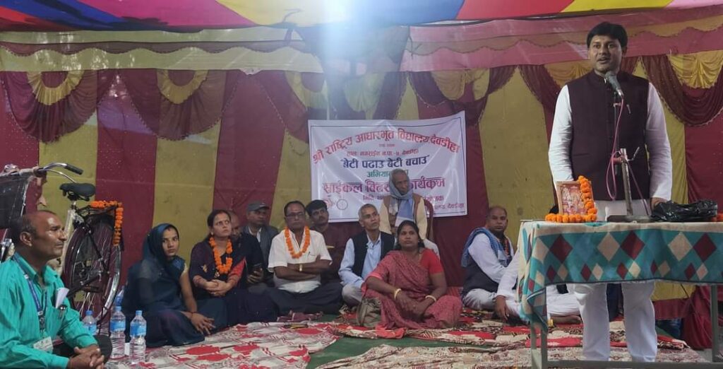 मुख्यमन्त्री बेटीबचाउ बेटीपढाउ कार्यक्रम अन्तर्गत नगराईन नपाको वाडा न ७ देवडिहा स्थित श्री राष्ट्रिय अधारभुत बिधालयमा आयोजित साइकल बितरण समारोहलाई सम्बोधन गर्दै नेता यादवले छोरीहरुको मनोबल उकास्न प्रदेश सरकार साईकल लिएर सर्व सधारणहरुको घर सम्म पुगेको बिषय विपक्षहरुलाई अपाच्य भएको बताउनु भयो।