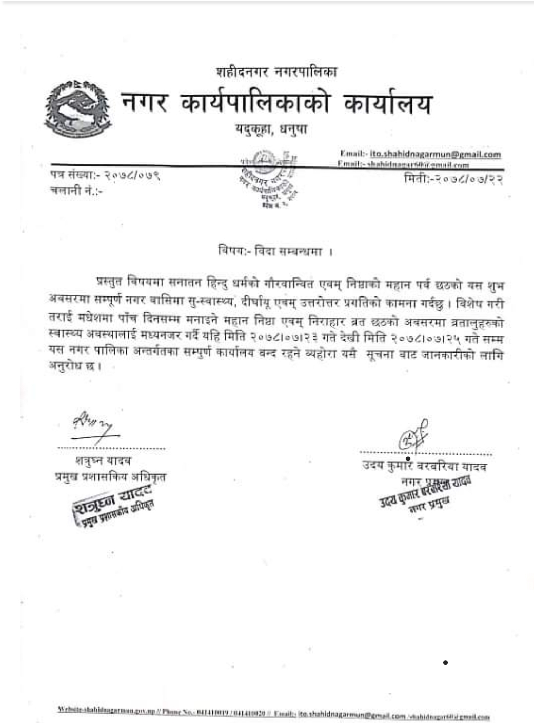 नगर प्रमुख उदय कुमार बरबरिया (यादव) र प्रमुख प्रशासकीय अधिकृत सत्रुध्न प्रसाद यादवको सँयुक्त हस्ताक्षरित सूचनामा कार्तिक २३ गतेदेखि कार्तिक २५ गतेसम्म तीनदिने सार्वजनिक विदा दिने निर्णय गरेको हो ।