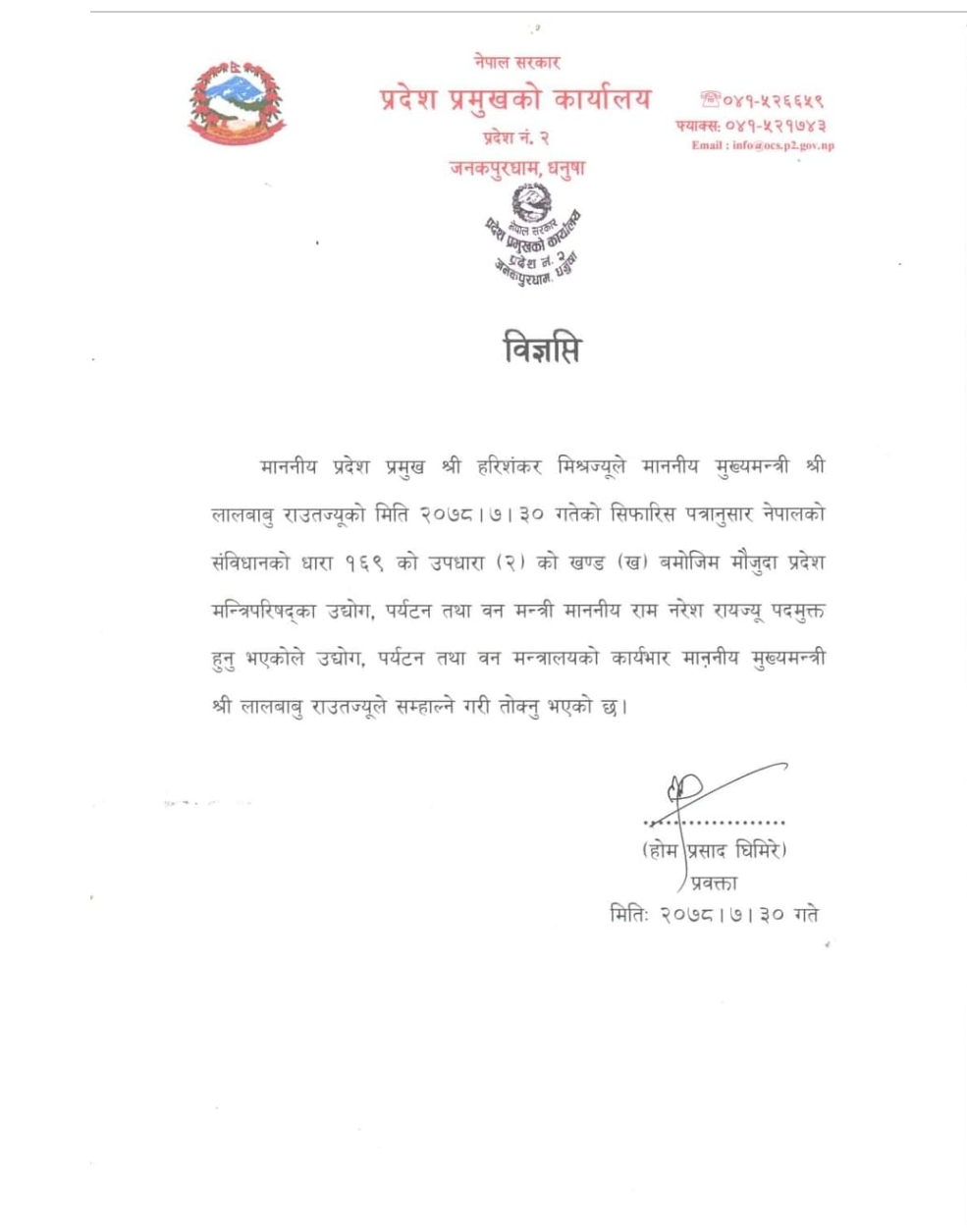जनकपुरधाम । प्रदेश २ का उद्योग, पर्यटन तथा वनमन्त्री रामनरेश राय पदमुक्त भएका छन् । मुख्यमन्त्री लालबाबु राउतको सिफारिसमा प्रदेश प्रमुख हरिशंकर मिश्रले मन्त्री रायलाई मंगलबार पदमुक्त गरेका हुन् ।