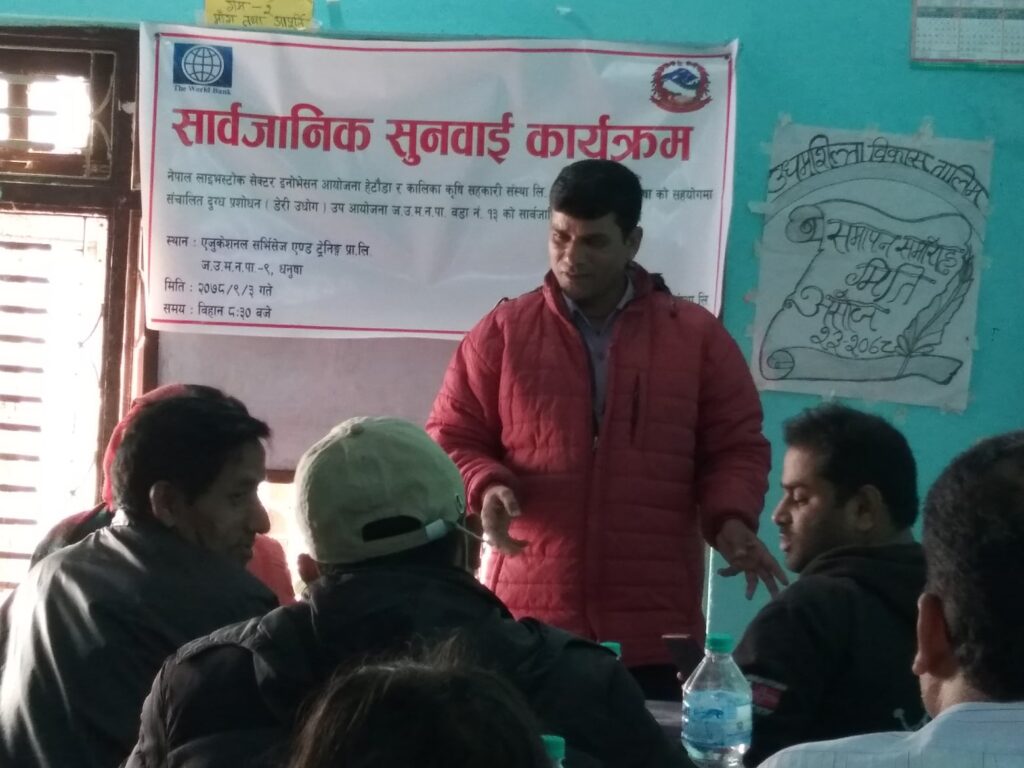 कालिका कृषि सहकारी संस्था लि.जनकपुरधाम-८ धनुषा र नेपाल लाईभस्टोक सेक्टर इनोभेसन आयोजना हेटौडा को सहयोगमा संचालित दुग्ध तथा दुग्धजन्य (डेरी उधोग)उप आयोजना ज.उ.म.न.पा को पहिलो सार्बजनिक सुनुवाई कार्यक्रम संस्थाकी अध्य्क्ष रिंकु कुमारी मिश्रको अध्य्क्षता तथा भुमि ब्यबस्था कृषि सहकारी मन्त्रालय पशु शाखाका प्रशासकीय अधिकृत डा.जिबेन्द्र झा ज्यु को उपस्थिति मा सम्पन्न भएको छ ।