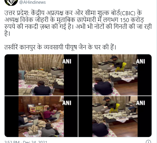 आनन्दपुरीमा बस्ने कन्नौजका ठूला पफ्र्यूम व्यापारी पियुष जैनको घरबाट ३६ घण्टा लगाएर १ सय ५० करोड नगद ब’रामद गरेको हो ।आईटी विभागले व्यापारी जैनको घरबाट ब’रामद गरेको उक्त पैसा गन्नका लागि ६ वटा बैंकहरुबाट ६ वटा मेसिन नै मगाउनु परेको थियो ।