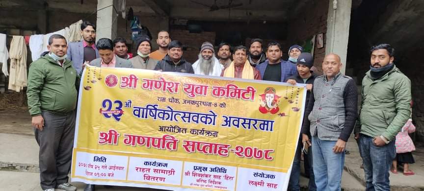 जनकपुरधाम  पुस २५ गते ।  जनकपुरधाम स्थित श्री गणेश युवा किमिटीको सप्ताहव्यापी २३ औं वार्षिकोत्सव कार्यक्रम ‘श्री गणपति सप्ताह – २०७८’ अन्तर्गत तेस्रो दिन कमिटिले जनकपुरधाम स्थित कबिर बालआश्रममा राहत समाग्री वितरण गरेको छ ।