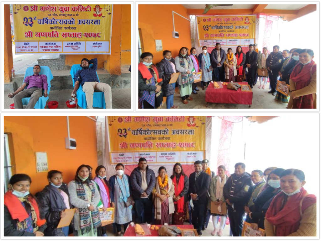 जनकपुरधाम,: जनकपुरधाम स्थित श्री गणेश युवा कमिटीले जनकपुरधामको महिला पत्रकारहरुलाई सम्मान गरेको छ । ‘श्री गणपति सप्ताह २०७८’ आयोजना गरि कमिटीले आफनो २३ औं वार्षिकोत्सव मनाउने क्रममा सप्ताहको पाँचौ दिन मंगलवार स्व. पत्रकार उमा सिंहको स्मृती दिवस पर्न गएकाले कमिटिले जनकपुरधाम कर्मक्षेत्र बनाएर पत्रकारिता गर्ने करिव डेढ दर्जन महिला पत्रकारहरुलाई सम्मान गरेको हो ।