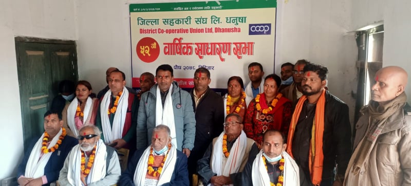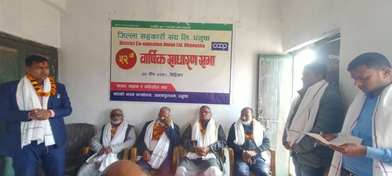 जनकपुरधाम : जिल्ला सहकारी संघ लि.धनुषाको ५२ औं वार्षिक साधारण सभा जनकपुरधाम जिल्ला सहकारी संघ कार्यालयको सभा हाल मुरलीचोकमा सम्पन्न भएको छ । संघका अध्यक्ष हरिश्चन्द्र प्रसाद हरिऔधको अध्यक्षता र जिल्ला समन्वय समिति धनुषाको प्रमुख रामदेव बनरैत यादवको प्रमुख अतिथिमा उद्घाटन गरिएको सभामा सहभागिहरुले सहकारी मार्फत नै सर्वसाधारणको जिविको परिवर्तन हुनेमा जोड दिए ।