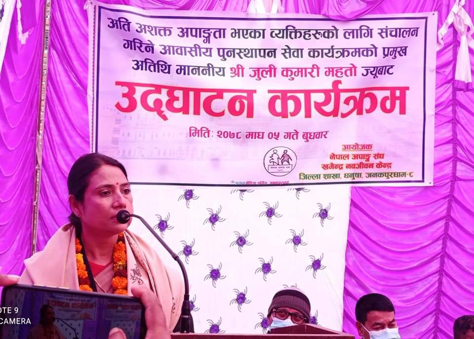 जनकपुरधाम ।  नेकपा एमालेकी नेतृ तथा महिला, बालबालिका तथा ज्येष्ठ नागरिक पुर्व मन्त्री जुली महतोले अपाँग प्रति मधेस सरकार मौन रहेको टिप्पणी गरेकी छन् ।