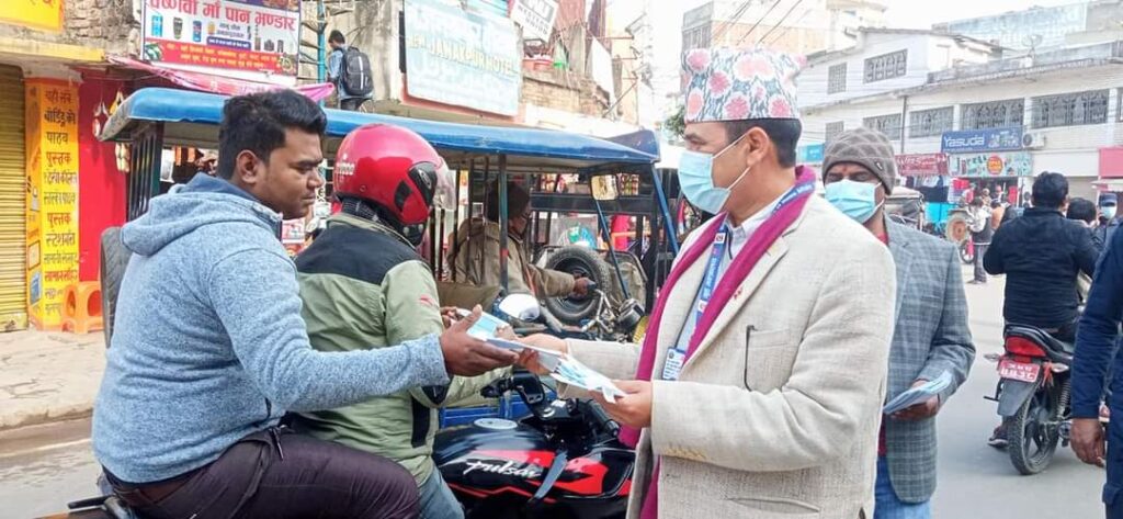 शुक्रबारदेखि मास्क लगाउन भन्दै चेतनामूलक कार्यक्रम गर्दा नलगाउनेलाई मास्क पनि वितरण गरिएको छ । जनकपुरधामको मुख्य बजार क्षेत्रमा मास्क लगाउन जनचेतनामूलक कार्यक्रम गरिएको छ ।