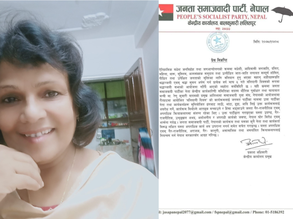जनकपुरधाम । आफ्नै पार्टीको मन्त्रीको अभिव्यक्ति विवादमा परेपछि जनता समाजवादी पार्टी, नेपालले विज्ञप्ति जारी गरेको छ ।