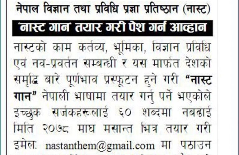 सूचनामा भनिएकको छ, ‘नास्टको काम कर्तव्य, भूमिका, विज्ञान प्रविधि एंव नव प्रवर्तन सम्बन्धी र यस मार्फत देशको समृद्धि पूर्णभाव प्रस्फूटन हुने गरी “नास्ट गान” नेपाली भाषमा तयार गर्नु पर्ने भएकोले इच्छुक सर्जकहरुलाई ६० शब्दमा नबढाई मिति २०७८ माघ मसान्त भित्र तयार गरी तल फोटोमा भएको इमेलमा पठाउन हुन नास्ट हार्दिक आव्हान गर्दछ ।’