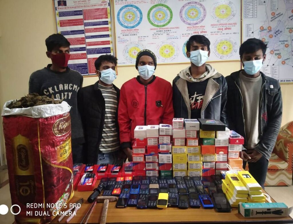 उक्त पसल फुटाई विभिन्न कम्पनीका मोबाइलहरु चोरी भएको भन्ने खबर प्राप्त हुनसाथ खटिएको प्रहरीले अनुसन्धानको क्रममा बिशाल मुखियाको घर तलासी गर्दा उनी सुत्ने खाट मुनि ३ वटा झोलामा लुकाई राखेको विभिन्न कम्पनीको ९४ थान मोबाइल सेट, ब्याट्री, चार्जर, राउटर र सोही घरको पहिलो तलामा रहेको चामलको बोराभित्र लुकाई राखेको ६ किलोग्राम अवैध लागूऔषध गाँजा समेत फेला पारी उनीहरूलाई पक्राउ गरेको हो ।