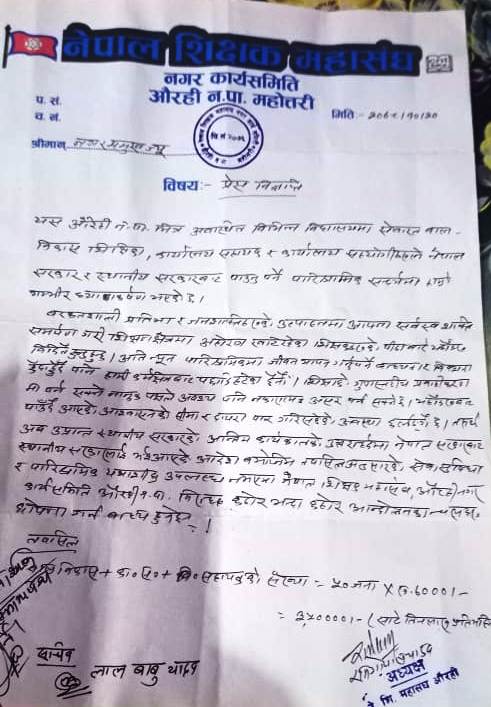 जिल्लाको औरही नगरपालिकाका शिक्षक महासंघका सहायक गोपाल यादवको नेतृत्वमा नगर प्रमुखलाइ ज्ञापन पत्र बुझाइएको जनाइएको छ । नगरपालिकाभित्रका विभिन्न विद्यालयमा रहेका बाल विकास शिक्षिका ,कार्यालय संस्थापक र कार्यालय सहयोगीहरुले नेपाल सरकार र स्थानीय सरकारबाट पाउनु पर्ने पारिश्रमिक नपाएको गुनासो गर्दै ज्ञापन पत्र बुझाइएको छ ।