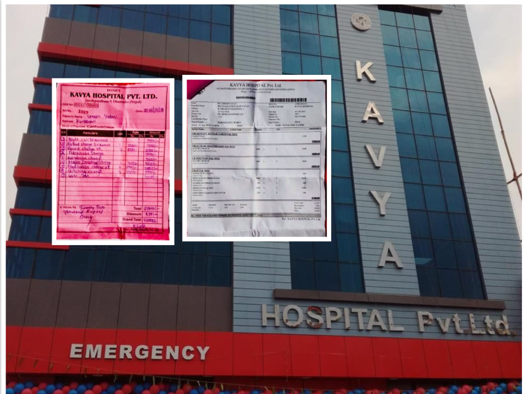 मनोजलाई काव्या अस्पतालले उपलब्ध गराएको रु २२ हजार ८ सय ५० को बिलमा जथाभावी खर्च देखाएको पाइएको छ । बिलमा २ पटक एडमिसन चार्ज नै उल्लेख गरेर रु ५ सय थप रकम जोडिएको छ ।