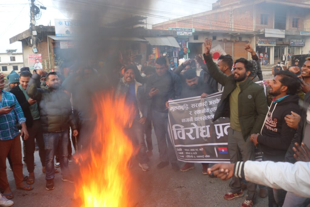 भैरहवा । एमाले निकट राष्ट्रिय युवा संघ, नेपाल रोहिणी गाउँपालिका कमिटी, रुपन्देहीले शनिबार सांझ धकधईमा विरोध प्रदर्शन गरेको छ । मूल्यवृद्धि र स्थानीय तहको निर्वाचन नगर्ने चलखेलविरुद्ध प्रदर्शन गरिएको युवा संघले जनाएको छ ।
