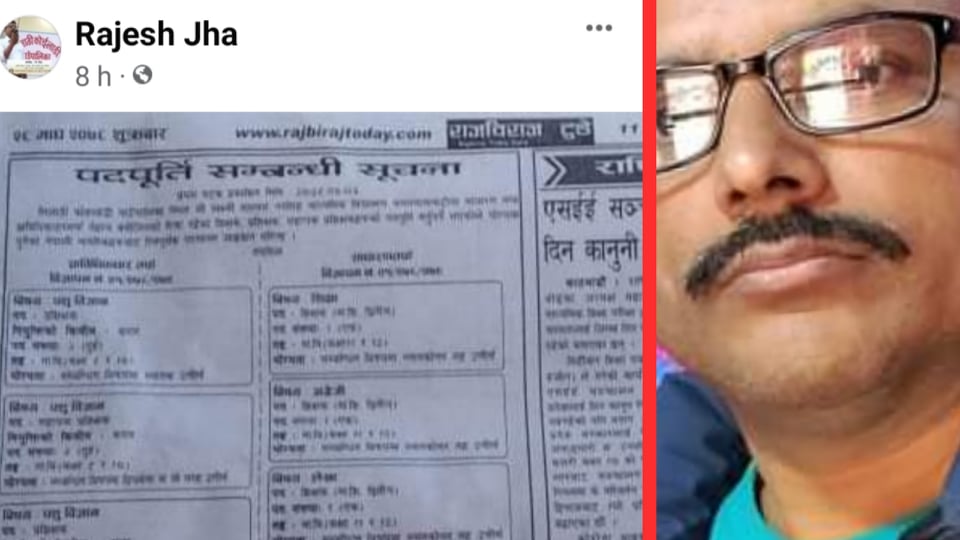 त्यही समयमा करार र दरबन्दी पदपूर्तिको विज्ञापन प्रकाशन गर्ने समय माघ २३ गते रहेको थियो । कसैलाई थाहै नदिने गरि २६ गते नै सार्वजनिक गरेको थियो। त्यतिके होईन, विज्ञापनमा चलानी नम्बर नै छैन अभिभावक उपेन्द्र यादवले भनेको थियो ।