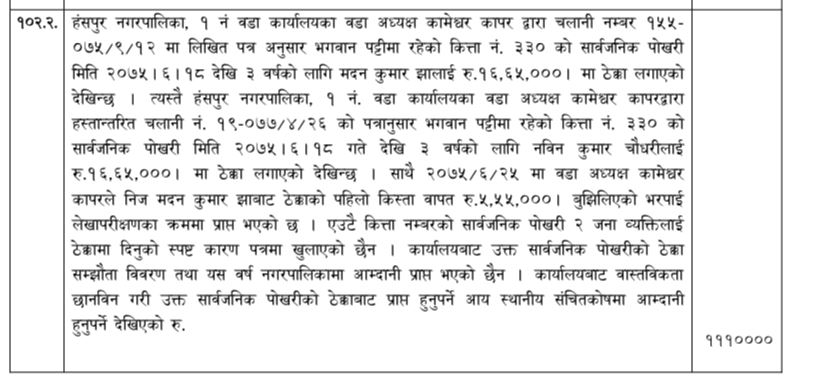एउटै पोखरी २ व्यक्तिलाई ठेक्का लगाएको, पोखरी ठेक्का सम्झौता विवरण र आम्दनि नगरपालिकालाई प्राप्त नभएको भन्दै महलेखापरीक्षकको प्रतिबेदनमा ११ लाख १० हजार रुपैया वडा अध्यक्ष कापरबाट असुल उपर गर्न दिइएको निर्देशन अनुसार राजश्व असुल उपर गर्न नगरपालिकाले ७ दिन भित्र रकम दाखिला गर्न पत्रचार गरेको छ ।