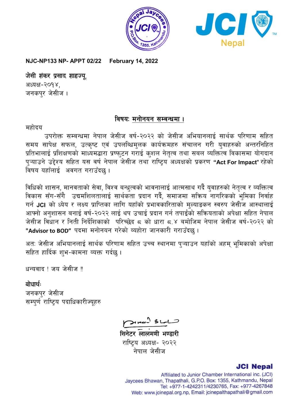 जनकपुरधाम : जनकपुर जेसीज वर्ष २०१४ का शाखा अध्यक्ष आदरणीय जेसी शंकर प्रसाद शाह नेपाल जेसीज बर्ष २०२२ को लागि एड्भाइजर टु बोड जस्तो गरिमामय पदमा मनोनीत भएको छ।