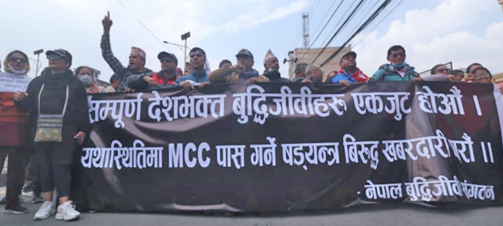 उनीहरुले प्रदर्शनमा ‘सम्पूर्ण देशभक्त बुद्धिजीवीहरु एकजुट होऔं, यथास्थितिमा एमसीसी पास गर्ने षडयन्त्रविरुद्ध खबरदारी गरौं’ लगायतका नारा लगाएका थिए ।
