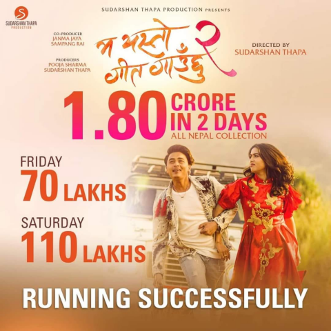 शुक्रबारबाट प्रदर्शनमा आएको फिल्म ‘म यस्तो गीत गाउँछु २’ले आइतबारसम्मको प्रदर्शनबाट १ करोड ८० लाख रुपैयाँको आम्दानी गरेको छ।