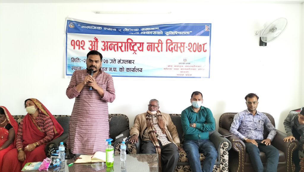 सप्तरी,फागुन २४ गते।                               सप्तरीको बोदे बर्साईन नगरपालिकामा पनि ११२ औं अन्तर्राष्ट्रिय नारी दिवस मनाएकाछन् ।” महिलाको सरक्षा, सम्मान र रोजगार : समृद्ध नेपालको आधार” मूल नाराका साथ बोदे बर्साईन नगरपालिका महिला तथा बालबालिका शाखाले मनाएकाछन् । विभिन्न महिला हिंसा अन्त्य सम्बन्धि नारा लगाई बोदे बर्साईन नगरपालिका प्राङ्गनबाट निस्केको प्रभात फेरि बजार क्षेत्र परिक्रमा गरि पुन: बोदे बर्साईन नगरपालिकाको नयाँ भवनको हलमा भित्र आई सभमा प्रणत भएका थिए ।
