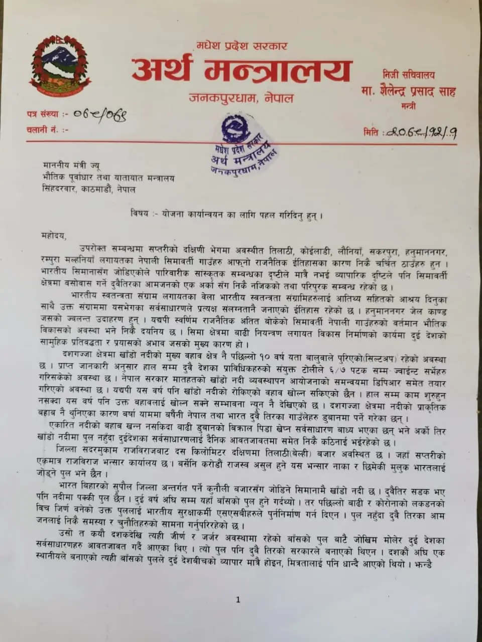 ‘भारत विहारको सुपौल जिल्ला अन्तर्गत पर्ने कुनौली बजारसँग जोडिने सिमानामै खाँडो नदी छ। दुवैतिर सडक भए पनि नदीमा पक्की पुल छैन । दुई वर्षअघिसम्म त्यहाँ बाँसको पुल हुने गर्दथ्यो तर पछिल्लो बाढी र कोरोनाको लकडाउनकोबीच जिर्ण बनेको सो पुललाई भारतीय सुरक्षाकर्मीले पुर्ननिर्माण गर्न दिएन। पुल नहुँदा दुवैतिरका आमजनलाई निकै समस्या र चुनौतिहरुको सामना गर्नुपरिरहेको छ’ पत्रमा भनिएको छ, ‘पुल नहुँदा सर्वसाधारण खाँडो खोलाबाटै वारपार गरिरहेका छन्, जुन वर्खामा जोखिमपूर्ण छ।’