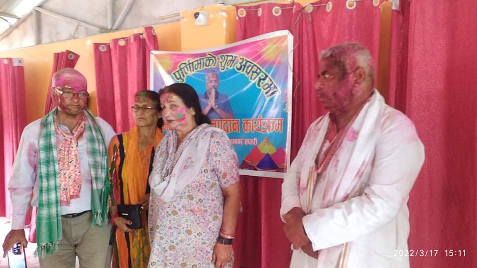 नेपाली संस्कृतिमा एक दिन अगावै पहाडे समुदायले होलि मनाइन्छ ।त्यसको भोलिपल्टै तराईवासीले होलि मनाउने परम्परा रहेको छ।एमालेका पोलिटब्युरो सदस्य प्याकुरेलको अनुरोधमा आज कञ्चनरुप नगरपालिका वडा नम्बर ९ स्थित फुलवारी पार्टी प्यालेसमा शुभकामना आदानप्रदान संगै रमाइलो होलि मनाएको हो।