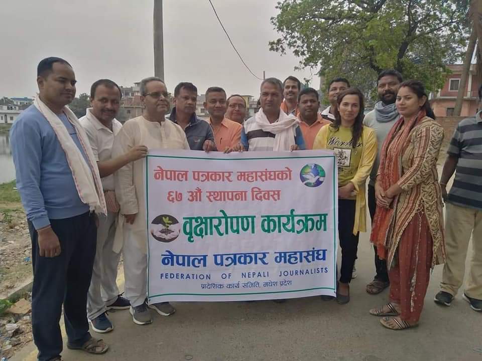 नेपाल पत्रकार महासंघकाे ६७ अाैं स्थापना दिवसको अवसरमा नेपाल पत्रकार महासंघ प्रादेशिक कार्य समिति मधेस प्रदेशले वातावरण संरक्षणको सन्देश दिदै जनकपुरधामकाे विसहारा पाेखरी को किनारमा वृक्षारोपण गरेका छन्।